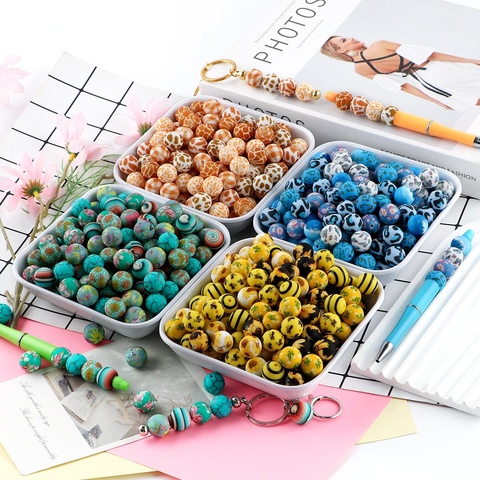 Personalizado en forma de 15mm de grado alimenticio artesanal multicolor 100 Uds juego de mezcla impreso bebé cuentas de silicona para la fabricación de bolígrafos